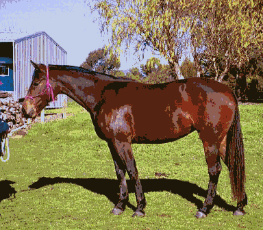 Perhaps stands over 15 hands and is a strong, classical Stock Horse type. Her rich bay coat has dappled out and she has a lot of leg under her. She is also proving to be extremely quick, responsive and very sensible. She has been to A.R.C., trail riding, showing, droving and lessons and taken all in her stride.