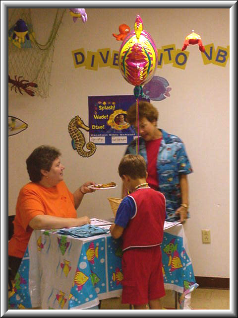 Miss Suzanne and Miss Susan sign up Awana clubbers for Vacation Bible School