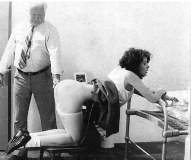 The fake detail, however, need not be an incongruously erotic detail, like the black lace under little St. Theresa's skirt. The fake detail is voluptuous by the very fact of its artifice. In the pictures on this page, this beautiful girl is obviously posing for a caning rather than being caned.