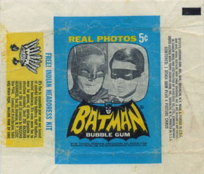 Batman Bat-Laff Series card wrapper. It would have contained four cards and a stick of gum. Total cost back then would have been a full nickel. On the side there is an offer for an indian headdress kit costing 250 Bazooka comics! |