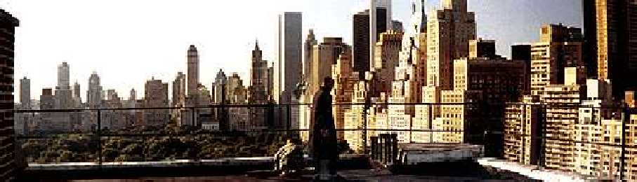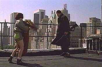 Léon and Mathilda arrive on the roof of a building which faces Central Park. They get close to a wall and maintain this position. Sunlight floods the park.