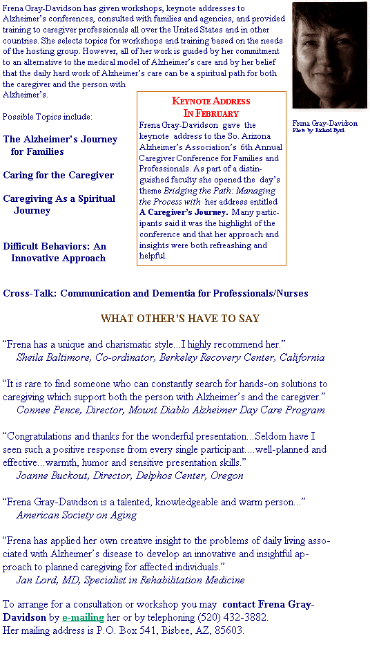 Frena Gray-Davidson is currently providing caregiver support groups for Cochise and Pima Counties in Southern Arizona. For further information you can contact the Agency on Aging in either of these counties.
