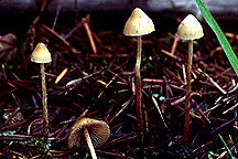 Figure 6: Psilocybe semilanceata , the Liberty Cap, a species common throughout the British Isles, France, Germany, Holland and Italy. Also common on the Pacific Northwest coast of the United States. Favoring sheep and cattle pastures.