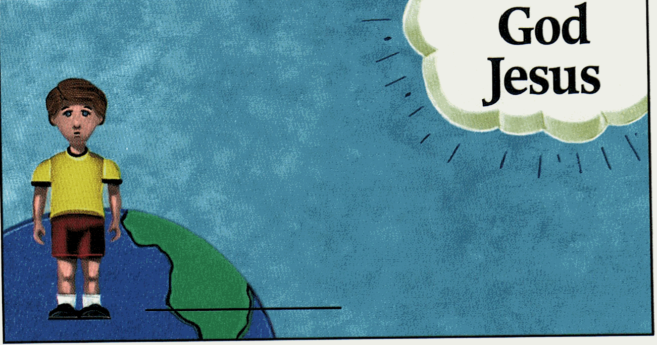 Let's imagine the bottom corner of this picture is our world. Who lives here? Write your name on the line under the picture of the child. This child will be you for the rest of this lesson. Is our world perfect? Our world is not perfect because of sin. The Bible says, "For all have sinned, and come short of the glory of God" (Romans 3:23). What is sin? Sin is choosing your way instead of God's way. Because of this attitude you do things God does not want you to do. These things are called sins. Have you ever done something you knew God did not want you to do?