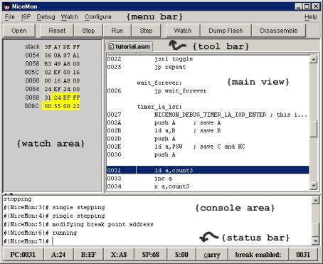 Watch: will add a watch to the watch area. If debug symbols are loaded NiceMon will prompt the user to select a variable to watch. If debug symbols are not loaded NiceMon will prompt the user for a name and address. NiceMon will then prompt the user for the number of bytes to be watched.