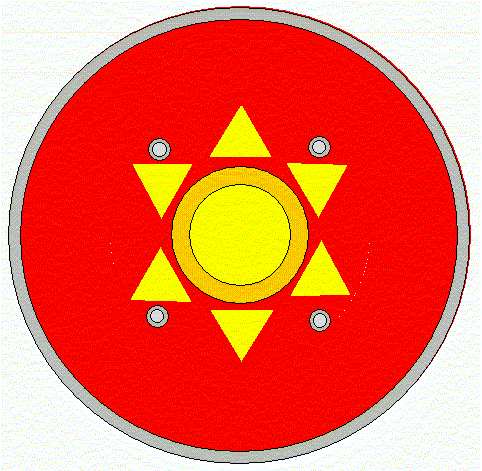 The Red Kaganate Sun Flag design lends itself quite well to shield design. The image presented here as an example is of a Simple Centre Boss round shield. Here, the Boss itself serves as the Sun disk. The triangles may be painted on or made in brass/bronze and riveted. A larger image file is provided below.