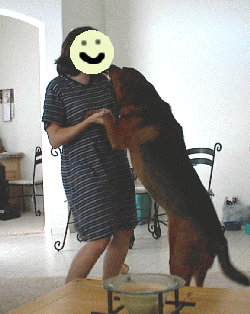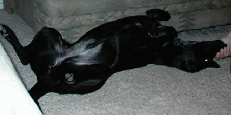 But despite their determination to keep Abby penned in my bedroom, Charlie and Sadie are good, sweet dogs. Here's a great picture of Charlie dancing with Cindy. Sadie is more committed to bellie rubs than dancing.