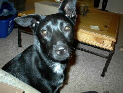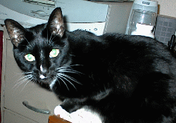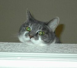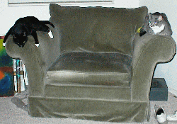 Afraid this isn't a very organized section. What to say next? Abigail has four "cousins" here in Mesa. Two of them, Lars and Fitz, are cats. Lars and Fitz are girl cats with boys names, but they seem reasonably well adjusted in spite of that fact. Both cats have pretty much ignored me until last week when Fitz decided that she loves me. Fitz gives very passionate hugs. She likes to work at the computer with me. This is a mixed blessing. Lars is softening about me. She rubs my legs now, but no hugs for me yet. Two things they DO like are my big grey chair and Abby's litter box. Fitz is a black and white "tuxedo" cat and Lars (also known as Petunia) is a soft grey. That's Lars looking down from a high cabinet where she loves to sit. Still need to get a good picture of Fitz. Both cats would like to be friends with Abby, I think, but at the moment she will have none of them.
