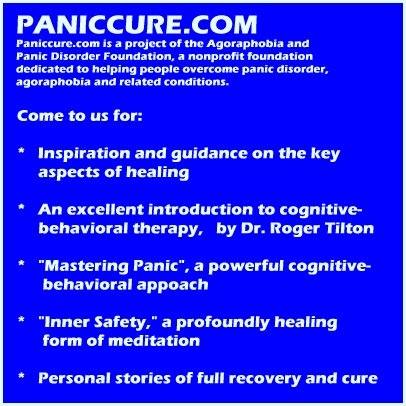 I recently came across a wonderful resource for people struggling with agoraphobia and other panic disorders. It's an excellent web site called PANICCURE.COM. If you are struggling or know anyone else who is struggling this is a good place to get some hope, some guidance and some excellent resource information.