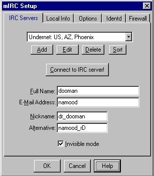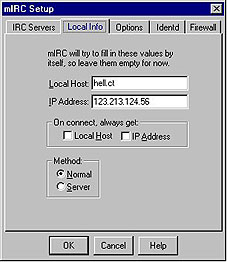 | En Aquesta pàgina parlaré del mIRC, per què és el que jo utilitzo, i me'l conec com si l'hagues parit jo . Mes endevant intentaré posar-me amb el pIRCh, el que em sap greu es no poder tocar el IRCle per què no tinc Mac, pero si me'n regaleu un , feré el que podré. ;-)> |