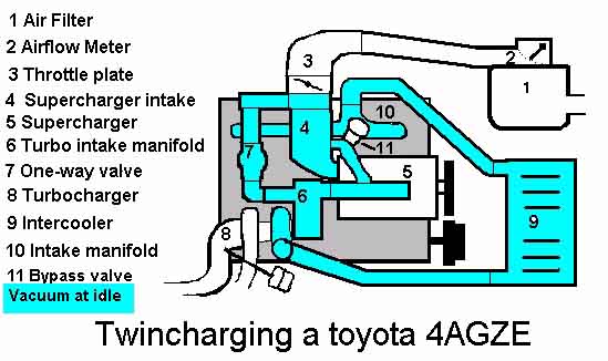 Photos of the individual pieces of the twincharger setup are on the TWINCHARGING PAGE