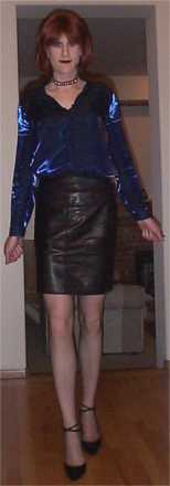 | A blue blouse and a black leather skirt. Oh, and some pretty shoes from ClassicPumps.com |