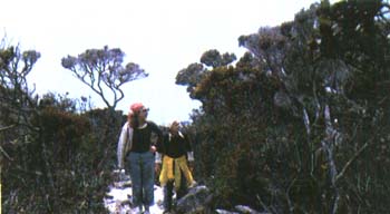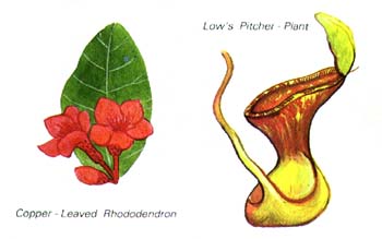 ![]() ![]() Most species grow in areas where the soil is poor, lacking in nutrients, and this ingenious method of obtaining nourishment has evolved to allow them to thrive in such places. This species has a graceful, flared pitcher, 20-23 cms (8-9 ins) in length, and is probably one of Kinabalu's most well-known plants. Though formerly common here, picking of the pitchers and uprooting of the plants themselves in the past, has sadly reduced the population. The mossy forest continues on past Kamborongoh (the Sabah Telecoms Station) at 2,225m (7,300ft), where a narrow track leads Up to the transmitters on the left. The name is derived from a plant locally called 'kamborongoh', in the Dusun language. that is used to ward off evil spirits. The site is a restricted entrance area. On the right the Summit Trail continues along the side of the ridge past an old landslide and up onto the ridge itself to the Third Trail Shelter, at more or less the same elevation as the Telecoms Station. A few yards further on the path divides. The left is a steep staircase leading up to the Sabah Radio and Television Stations at Layang-Layang, at 2,591 (8,500ft). This is another restricted entrance area.'Layang-Layang" in the Dusun tongue means 'Place of Swallows'. |