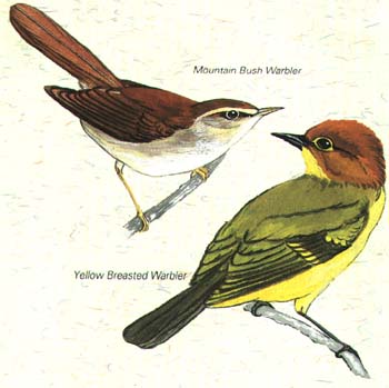 and several are named after her. Tree-ferns of several species are common. Look out here for little birds flitting or creeping through the bamboos and ferns. Perhaps two of the easiest to identify are the YELLOW- BREASTED WARBLER (Seicercus montis), a small bird, yellow with a chestnut head, up to 1 cm (4') in size and the MOUNTAlN BUSH WARBLER (Cettia montanus). 12 1/3 cm (5") in size. brown with a distinctive pale eye-stripe. A well-known but rather inconspicuous species ss the KlNABALU FRIENDLY WARBLER (Bradypterus accentor), so-called because of its habit of hopping about at the feet of the early climbers. It is a reddish-brown bird, 15cm (6') in size, with a spotted breast that is found only on Sabah's three highest mountains - Kinabalu, Tambuyukon to the north, and Trus-Madi to the south-east. Sadly it is now rather uncommon and not nearly so friendly. In 1970 it was reported as "Not seen so often as in the past. The great number of climbers now walking the mountain trail have probably driven the birds to quieter areas". Another birth that can be seen here is the PALE-FACED BULBUL(Pycnonotus flavescensl, a brown bird about 17 1/2 cm (7') in size with a distinctive white face and a deep-yellow vent. Many of the birds around the Park Headquarters can also be seen here.