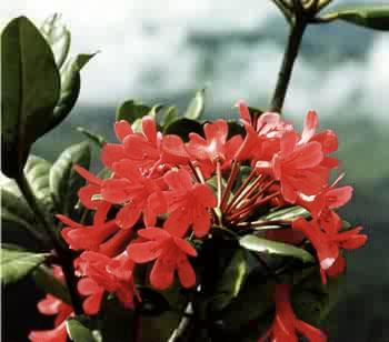 ![]() From the Fifth Shelter the path follows a gully with orchids and rhododendrons in abundance. The BOX-LEAVED RHODODENDRON (Rhododendron buxifolium) is in full bloom from February to April and its crimson flowers can be seen dotting the stunted vegetation round Panar Laban at this time. Another common species is the ROUGH-LEAVED RHODODENDRON (Rhododendron rugosum) with distinctive pinky-purple flowers. ![]() |
