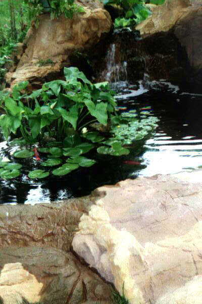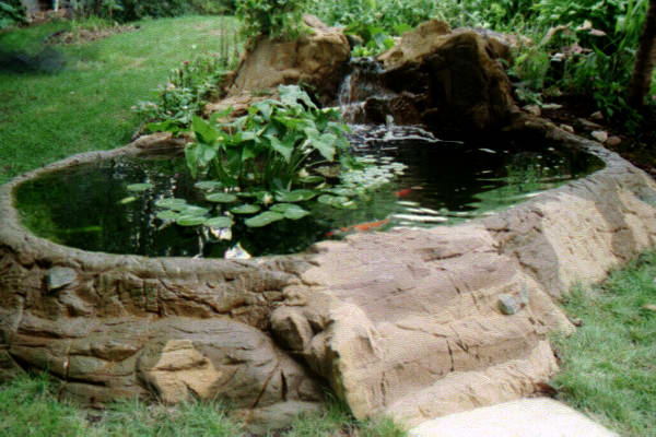 Here is the finished product. It is difficult to see in this photo, but the different slabs of molded concrete have been mixed with pigment before setting and show a variation in color. The multiple colors give a different dimension than just one solid coloration, just as natural rock tends to show. The dark areas here are from the water overflowing. The filled areas were all originally grey as concrete is known to be. I used two colors of a special acid wash to give the concrete a worn patina look and to nuetralize the pH at same time.