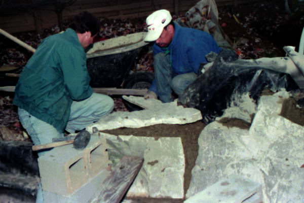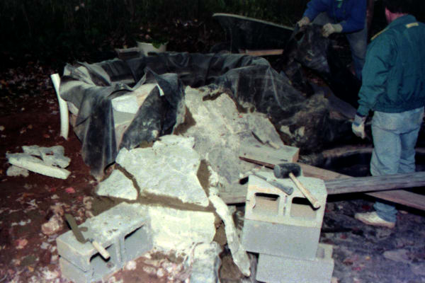 Step Two: After the slabs are solidly in place the gaps between each piece are filled with more concrete and allowed to set 2-4 hours before carving. This was one of the most creative methods that I enjoyed. I spent several nights after work trying to finish off areas by myself. As it was already dusk when I started I used a drop light and a "Scoot-n-Do" to manuever around the pond while I carved out rock formations. Several times I found myself the only human in the neighborhood awake while scooting around with my carving tool in the dark.