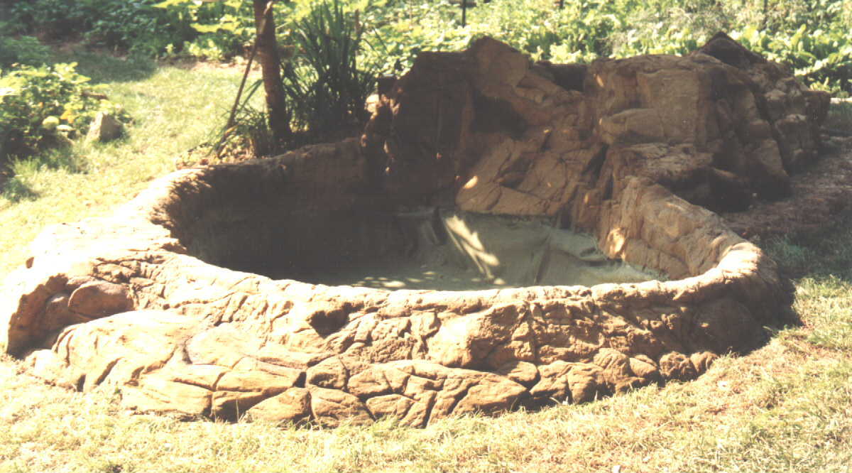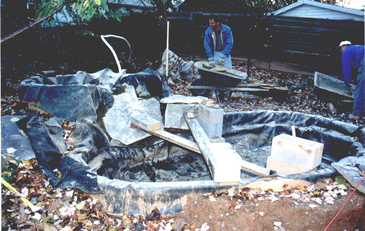 The only drawback to this was the extra expense and I had to apply generous amounts of lime to neutralize the acid wash around the soil of the pond. Another option would be to add pigment to the concrete while mixing. This may be desired if you cannot replace the surrounding soil. Through our constant trampping on the dirt and the chemicals I had to remove a good 6 inches of soil and replace it when I was ready to install my plants around the pond. This destroyed soil is currently being rebuilt near my compost pile. It will probably take several years at least to renew, but I did see a good population of "critters" inhabiting this soil the last time I disturbed it.