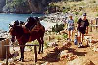 To není kůň, ale mezek. Jediný dopravní prostředek pracovníků rezervace. Vybírají odpadkové koše, udržují cesty, orientační značení a provozují několik tématicky odlišným muzejních objektů (rezervace Lo Zingaro, Fauna, Flora, Ptáci, Moře). Rezervace je přístupná po silnici od San Vita od severu a od Scopella z jihu. Na obou koncích jsou vstupní základny "direzione", kde lze koupit mapky a jiné upomínkové předměty. Vstupné se zde neplatí. Zajímavý je přístup od jihu, který začíná asi padesátimetrovým tunelem. |