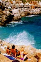 Jedna ze šesti pláží rezervace, v tomto případě pláž č. 3 - Calla Marinella. Když je tam dvacet lidí, tak je přeplněno. Podobně se chovají i ostatní pláže. Některé snesou i padesát, některé jen deset lidí. Záliv hraje všemi barvami za což mohou různobarevné oblázky. V době naší přítomnosti tam bylo dosti bouřlivo. Počasí krásné, vlny divoké. Pláž je oblázková, vysedává se na skalách kolem pláže. Pokud chcete obhlédnout okolní pobřežní skály, doporučuji boty. Některé skály jsou příbojem vymodelovány do břitů seker. Z koupání na těchto plážích je větší požitek než z lázně v šampaňském nebo v panenské krvi. |