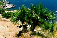 Tak toto je místní rostlina číslo jedna - Palme nane (Chamaerops humilis) - palma nana. Tato je obzvlášť atraktivní exemplář vysoký asi dna metry. Většinou jsou menší, ale stejně půvabné. V jednou muzejním objektu jsou vystaveny různé užitné i dekorativní předměty, které lze z listů těchto palem zhotovit. |