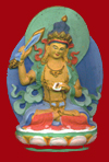 These five families (literally "lineages") are very important in the Nyingma and Kagyu schools, and play a central role in the Bardo teachings and practices composed by Guru Rinpoche and revealed by Karma Lingpa. On a simplistic level, each of these Families is associated with a) a Buddha (male aspect of Buddhahood); b) a Consort (feminine aspect of Buddhood); c) a cardinal direction; d) a primary color; and e) a mental obscuration, conflicting emotion, or "poison" (Sanskrit klesha, Tibetan dug which is transformed into f) a wisdom, or pristine cognition (Sanskrit jnana, Tibetan Yeshe. These are not to be looked at as separate from one's own mind. Depending upon the tradition from which the teaching or practice derives, the color and/or positions of the Buddha and Vajra Families are reversed from what is presented here. The arrangement below follows Karma Lingpa's text and is the predominant arrangement employed in the Nyingma school. The Buddha/Consort union (Yabyum) is symbolic of the union of compassion and emptiness: primordial wisdom, and should not be conceived of as a carnal activity. The practices of the "Hundred Peaceful and Wrathful Deities" associated with this Terma require empowerment, so the texts and practices will not be referenced here. However, teachings about the Bardos are available in: The Tibetan Book of Living and Dying (an excellent introductory text), The Bardo Guidebook, The Mirror of Mindfulness, Natural Liberation: Padmasambhava's Teachings on the Six Bardos (a recent book by Gyatrul Rinpoche), and discoveries of teachings by Guru Rinpoche (Padmasambhava) by Karma Lingpa. 1. Tathagata or Buddha Family (Sanskrit Tathagatakula, Tibetan Deshin Shegpa Rigs): a) Buddha: Vairocana b) Consort: Akashadhatvisvari c) Direction: Center d) Color: Blue e) Obscuration: Ignorance/delusion (Sanskrit moha, Tibetan gti mug) f) Wisdom: Wisdom of the Expanse of Reality (Sanskrit Dharmadhatujnana, Tibetan chos dbyings ye shes) 2. Vajra or Indestructible Family (Sanskrit Vajrakula, Tibetan Dorje Rig): a) Buddha: Vajrasattva b) Consort: Buddhalocana c) Direction: East (front) d) Color: White e) Obscuration: Anger/hatred (Sanskrit dvesa, Tibetan zhe sdang) f) Wisdom: Mirror-Like Wisdom (Sanskrit Adarshajnana, Tibetan Melong Yeshe) 3. Ratna or Jewel Family (Sanskrit Ratnakula, Tibetan Rinchen Rig): a) Buddha: Ratnasambhava b) Consort: Mamaki c) Direction: South (right) d) Color: Gold (yellow) e) Obscuration: Pride (Sanskrit mana, Tibetan nga rgyal) f) Wisdom: Wisdom of Equanimity or Sameness (Sanskrit Samatajnana, Tibetan mNyam nyid Yeshe) 4. Lotus Family (Sanskrit Padmakula, Tibetan Padma Rig): a) Buddha: Amitabha b) Consort: Pandaravasini c) Direction: West (behind) d) Color: Red e) Obscuration: Desire/Attachment (Sanskrit raga, Tibetan 'dod chags) f) Wisdom: All-Discerning Wisdom (Sanskrit Pratyaveksanajnana, Tibetan So sor rtog pa'i Yeshe) 5. Karma or Activity Family (Sanskrit Karmakula, Tibetan Lakyi Rig): a) Buddha: Amoghasiddhi b) Consort: Samaya Tara (Green Tara) c) Direction: North (left) d) Color: Green e) Obscuration: Envy (Sanskrit irsya, Tibetan phra dog) f) Wisdom: All-Accomplishing Wisdom (Sanskrit Krtyanusthanajnana, Tibetan Bya ba grub pa'i Yeshe ) |