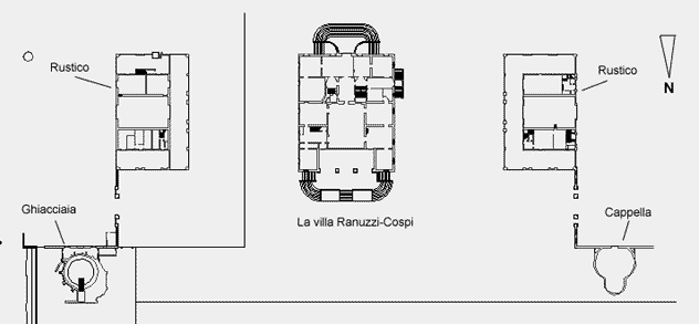 La nuova villa venne costruita instaurando un preciso rapporto prospettico con il castello di fronte, teso a creare uno spazio urbanistico unitario, sia pure fra due diverse proprietà. Al nucleo centrale, la residenza signorile, vengono affiancati due grandi edifici rustici porticati, poi ancora due edifici con facciata a "pendant" (la cappella e la ghiacciaia) che ampliano le dimensioni del fondale prospettico rappresentato dalla villa rispetto al castello. E' evidente il riferimento alle nuove esperienze della scenografia, che a Bologna divenne la più aderente interprete dell'esigenza barocca per gli spazi infiniti. Sulla strada che divide le due proprietà si affacciano due cancelli identici, costruiti in accordo fra i due proprietari, per mettere in comunicazione i due grandi prati fra le ville in occasione delle prime fiere di Bagnarola. L'ingresso abituale alle ville è invece laterale, per accentuare l'effetto di sorpresa.