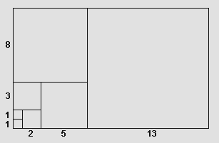 ![]() Il tendere della successione di Fibonacci alla sezione aurea può essere visualizzato attraverso l'accostamento di quadrati il cui lato è adiacente quello dei precedenti. Il limite all'infinito della serie produce un rettangolo i cui lati sono tra loro in rapporto aureo.