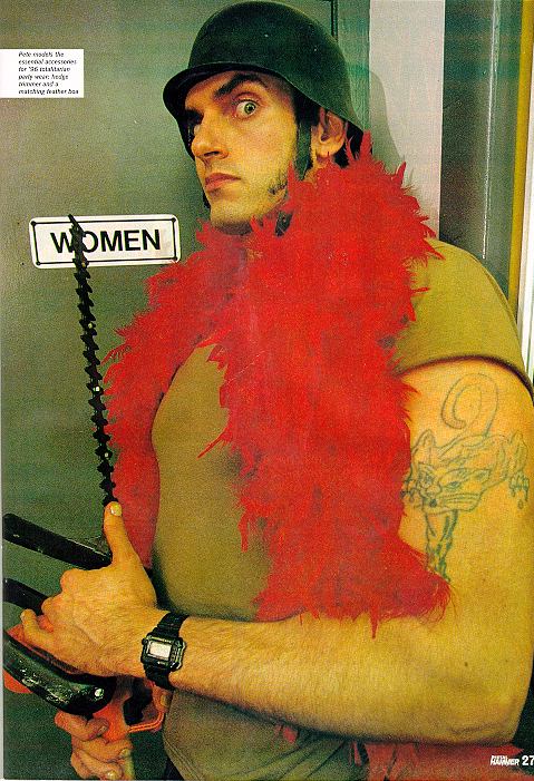 Pete models the essential accessories for '96 totalitarian party wear: hedge trimmer and a matching feather boa