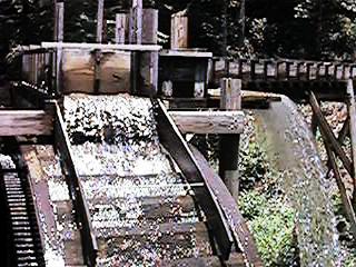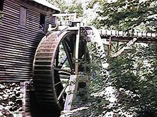 Hagood Mill is an overshoot type, that's when the water is run over the top of the wheel and gravity does the work. The other type of mill was an undershoot, that's where the river flow was fast enough to directed against the bottom of the wheel. The stream or river is dammed upstream and a trough is run along the hillside down to the mill where it is guided over the wheel. A gate is used to turn the water onto the wheel or not for turning the machinery on and off. Inside the mill there are more machanisms than just the grinding wheels. Gears and belts drive the other things too: corn shucker, kernaler, sifter and such. It was really automated for the times.