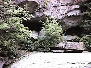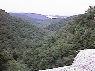 Down at the bottom there's an overhanging boulder, a small, shallow cave of sorts. It's the same boulder the other path leads to at the top. There's also probably the remains of another campfire too back up in the cave looking part. There's also some writings on the granite, the usual initials and dates, one looks like it was put there in 1921. There's another boulder under the bigger boulder and just enough room to crawl up onto it and sit. The view from there is nice, especially during the Summer storms. Just sit there all bundled up in blankets and towels, listen to the thunder roll up the gorge, watch the trees sway in the wind blown rain. Probably along with a bit of praying that the lighten doesn't strike the big boulder and bring it down on top of you. [Been there, done that.]