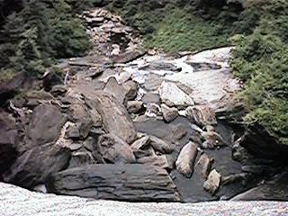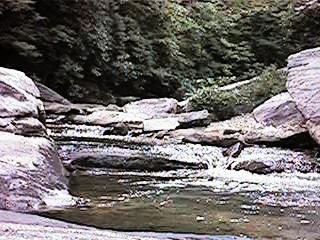 Along side the right of the falls there use to be a trail down to the lower tier and from there on down to the bottom. It's another one of them un-official trails. There was a really bad ice storm a few years ago and several trees fell. That made it into a hard climb, it wasn't that easy to start with. There's a pool at the bottom where this side trail comes out. That's where all the adventurous young people go. Most usually go down to the foot bridge and climb back upstream to get to it. It's cool down there even on the hottest Summer days. But climbing back out in the humidity and heat wears that off fast enough. [Been there, done that too.]