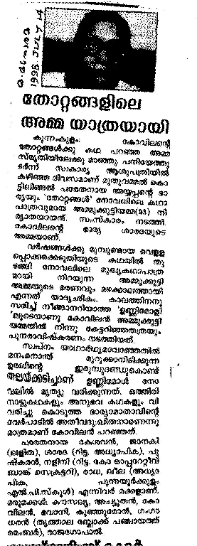 Unnimol of Thottangal passes away - news in Malayala Manorama