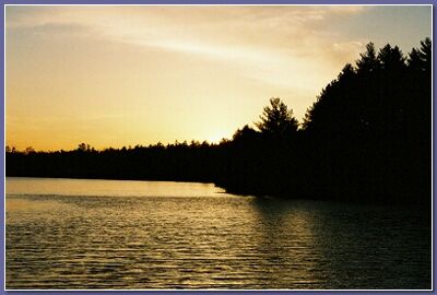 A few shirred clouds drift on the western horizon, violet and pink. A fish jumps. Two loons swim past. A tiny moth wobbles by. Bon voyage.