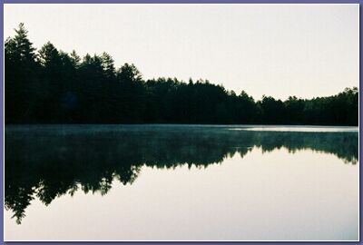 A thrush calls. Mist rises from the water. A white-throated sparrow sings.