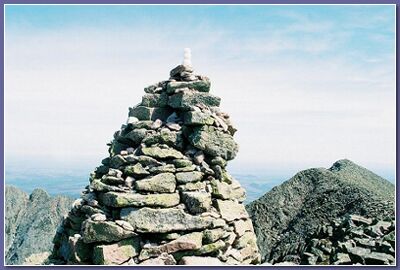 There’s snow up here, damp enough from the sun’s rays that I make three snowballs and add them to the top of a tall cairn that points to the Knife Edge, a narrow jagged way across to a somewhat lower peak, Pamola.