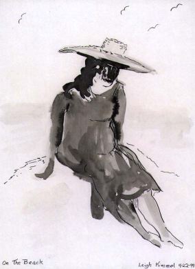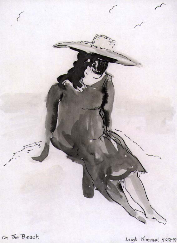 This ink-wash drawing was done as part of a life-drawing class at John A. Logan College. When the model donned a floppy beach hat, I just couldn't resist adding in a background of sand and surf, complete with seagulls on the wing.