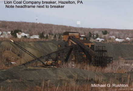 Here are some shots of a breaker in Hazleton PA. The Archer book, History of the Lehigh Valley Railroad, shows a picture of it on page 280 and names it as the Lion Coal Company. It is owned by Pagnotti Enterprises and from my sources, is not used. Trespassing in the area is verboten as the CONRAIL yard borders on the rugged landscape owned by the coal company. I found a hill overlooking the area, and used a telephoto lens to get the shots. My old scanner could not handle the tonal quality of the photos and translate them to monochrome. The light meter might have been fooled a little as the breaker came out dark and the well-lit sandy colored rocks came out good.