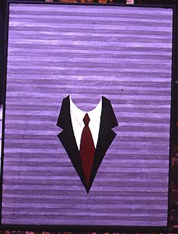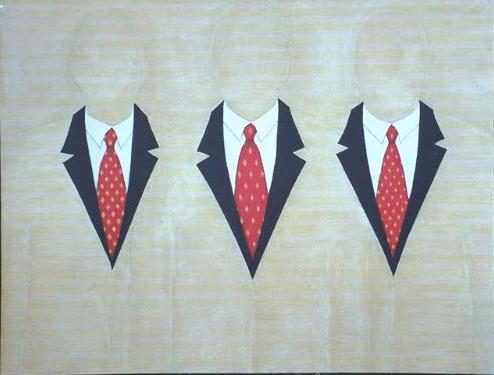 There is an old joke about the platypus having been designed by committee; thus the ridiculous combination of mismatched body parts. The Contradictions go beyond the animal's appearance to its function, as indicated in the title of this group exhibition: It's a Mammal But it Lays Eggs. Group shows in general tend to share that "Chex Mix" quality with the playtpus. After all, they too have been designed by committee. This group exhibition hangs together better than many, despite the very different styles of the seven artists. Perhaps because the artists are roughly at the same level of expertise. All of them work primarily with some form of two-dimensional mixed media, and all have at least one of their degrees from Virginia Commonwealth University. They are: Andras J. Bality, Nathan Buttleman, Gregg Carbo, Stephen Clark, Danny Drotos, Bill Fisher, and Louis Poole. I have a hunch that the platypus mascot also represents each individual art work: each single piece manifests seemingly contradictory elements. Take Stephan Clark's mixed media canvas, in which series of stiffly rendered objects-loaves of bread, marching soldiers-are juxtaposed against scribble bursts and smears of paint. These blobs and scrawls seem to say: sometimes we just contain ourselves. Chaos bubbles over. And then there are Louis Poole's oil and graphite drawings of houses, in which the deft rendering of architectural structure is imbued with painterly swaths of color. The deliberately added-on bright pastels remind me of old hand-tinted photographs . Diebenkorn comes to mind as well, in the use of vivid color tamed into geometric figure structure. Bill Fisher's mixed media pieces on wood look like something out of the last Corcoran Biennial, Painting Outside Painting: works concerned with the formal aspects of painting, but not necessarily paint itself. Fisher's monochromatic facades of oil, wax, and plaster on wood, play with positive and negative space. Openings between slates of wood (dark) are contrasted with plastered gaps between slats (white).Fisher's works, especially his largest untitled piece (#11) have a wonderfully waxy, buffed surface that beckons to be touched. Andras Bality's oil paintings are figurative and yet, on another level, abstract. All involve water, the rhythm of which provides the abstract element. Often there is a disturbing image downplayed among images of banal, peaceful pastimes.In Stuart, Where's Stuart? there is a couple chatting and children playing in the shallow water of the foreground, while in the background a man has fallen overboard and is offered a life preserver. In Hospital Reflection During Flood, a depiction of two boys calmly leading horses above contrasts with the scene in the reflection below, where medical personel carry people on gurneys. Only one of Bality's paintings in this show does not include a dog-the dog in the water seems to symbolize rescue, or the possibility thereof. Danny Drotos' shaped plywood mixed media works are platypus like in their physical combination of materials as well as the stream-of-consciousness memories/fantasies that are their subject. His two cut-out plywood pieces, Inside, and Blow Out, contain Popish funky car-imagery, with hints of human forms, and phrases of text scratched in: "do you know where the danger zone is", and "I remember my first kiss/I was frantic and scrambled between the front and back seats like a gerbil". These two appealing pieces, refreshingly, do not ask to be taken too seriously. Drotos' drawings are spontaneously witty, especially Better than Before, Smarter, in which a robot/business man (he has buttons and gadgets on him but appears to be wearing a suit), whirs away on his many legs like an overwound toy. Nathan Buttleman's acrylic paintings are all similar. They even have the same titles:Proxy.1, Proxy.2 , Proxy.3 , and Triproxy Prime. Each depicts a clearly visible power tie, collar, and suit lapel combination. Beyond the suit, a human outline disappears into a white noise background of parallel horizontal lines. The group of canvases are as interchangeable as a group of uniform-clad men glimpsed during the rush hour commute. The implications of anonymity in the white collar techno-field are all too obvious. Gregg Carbo is represented by one space-consuming work, Nought Point, a long horizontal (45" by 245") series of white or black, created through a combination of processes. Some panels have been folded, wetted, and swept with a broom to leave random marks. Together the pieces stream along like scenes reduced into a photographic negative or movie reel. There is a mathematical order behind this piece, according to Curator Sarah Tanguy's text, but it is not apparent to the viewer. Despite the great differences in style, there are comparisons to be drawn in this show as well as contrasts. Poole and Fisher both take some inspiration, it seems, from weathered architectural facades, bringing to mind tensions between the urge to build and the inevitability of decay. Clark, Carbo, and Bality all play with contrasts between random and ordered form and imagery, albeit with quite different methods. Like the platypus itself, a strange mix of ingredients adds up to something which works swimmingly. There are twenty-four well chosen art works in It's a Mammal, But it Lays Eggs, just enough to represent each artist's body of work, without rambling. (The silver lining of a small gallery space: it forces artists and curators to pick the cream of their crop.) As a group, the work of these seven artists demonstrates that drawing and painting are far from extinct as vital art forms.