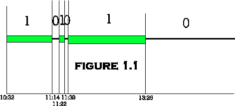 When projected before our eyes, the exposed film of the movies consists of 40% black, or negative space, interspersed with 60% of marginally different static images. It is possible to refer to this motion as a binary code of 1(on) and 0(off). Similarly one could use this system to chart regular movement and interaction in a series of 1 and 0 whenever two characters interact as a series of ‘off’ and ‘on’. For example, when I do not see my friend, they to me exist as 0, and similarly from my comrade’s perspective, I do not exist for that time when we are apart. From this it would seem possible to chart a timeline for an ordinary day that consisted in these such dyads (in a system that mimics the linear temporal notation of a scene of action on many computer animation programs). [Wince at Figure 1.1] A map which serves to navigate one through a pre-set unit time will therefore be a personal project recognisable only in the first-person, by each first person, just as the primary vision from which it was translated.