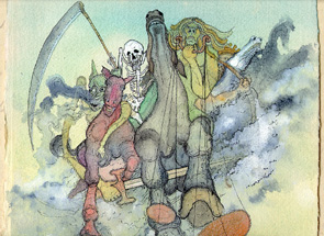 "Quando o Cordeiro abriu o primeiro dos sete selos, olhei e ouvi um dos quatro viventes, que dizia com voz de trovão: "Vem". Olhei e vi um cavalo branco. O que o montava tinha um arco; foi-lhe dada uma coroa e partiu vencedor para novas vitórias."