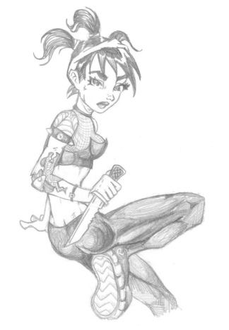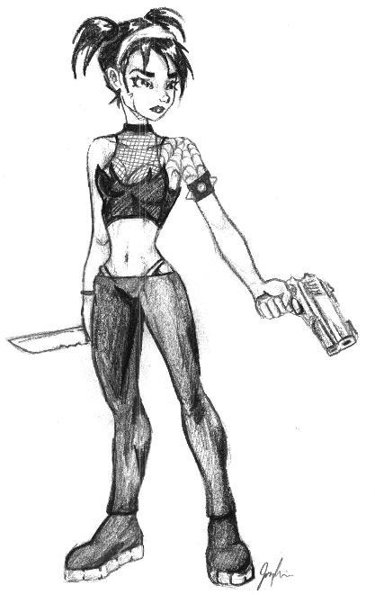 This is the first picture I drew of Fairchild, from Gen-13. The first thing that seems to come to mind when other people see this one is "damn, her calves are really big", which is kind of annoying on my part. I really think that this one is good, I like the way her face looks, and this was my first original, non- Sailor Moon-like drawing