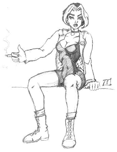 This is a new character, from the DV8 comic book. Her name is Sublime, and basically I just like her because she wears blue lipstick like me. I think this drawing is pretty good, and frankly I'm quite proud of it. If you don't like it, then e-mail me and I'll chew you out.