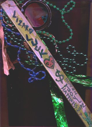 Voodoo Garden Blessing Stix are funky folk art made by French Quarter outsider artist, Rosemary Basil aka Rosalita Margarita de Malabar on her balcony in New Orleans. In the psychedelic 60's, this bohemian artist raised two daughters while working jobs from seamstress to tourguide to librarian. She lived in 20 places in 20 years then moved to New Orleans where, inspired by the local Voodoo and Mardi Gras cultures, she began to paint and create in a fervor and became a recluse due to illness and disappointments.