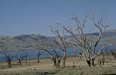 When the water is low, the streets and structures of old Tallangatta rise like ghosts from their watery grave."