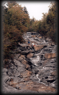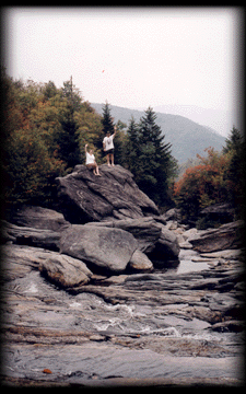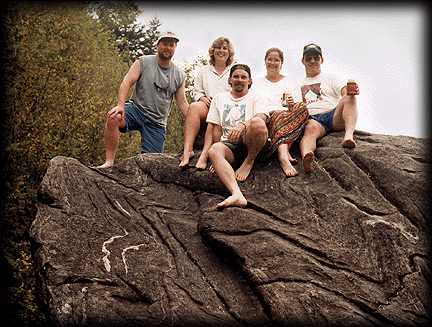 Spending time at the Rock. After a bit of trailblazing, circling around, Heide busting her arse and much cussing from the troops we arrived at this sweet spot in the middle of large stream, complete with cascading waterfalls. The area is in the vacinity of Black Balsam mountain, in Western North Carolina, bordering the Shining Rock Wilderness Area. The whole area is stranded somewhere between 5000 and 5900 feet in elevation. Dragging beer in here can be a bitch, but with this crew we had no choice.