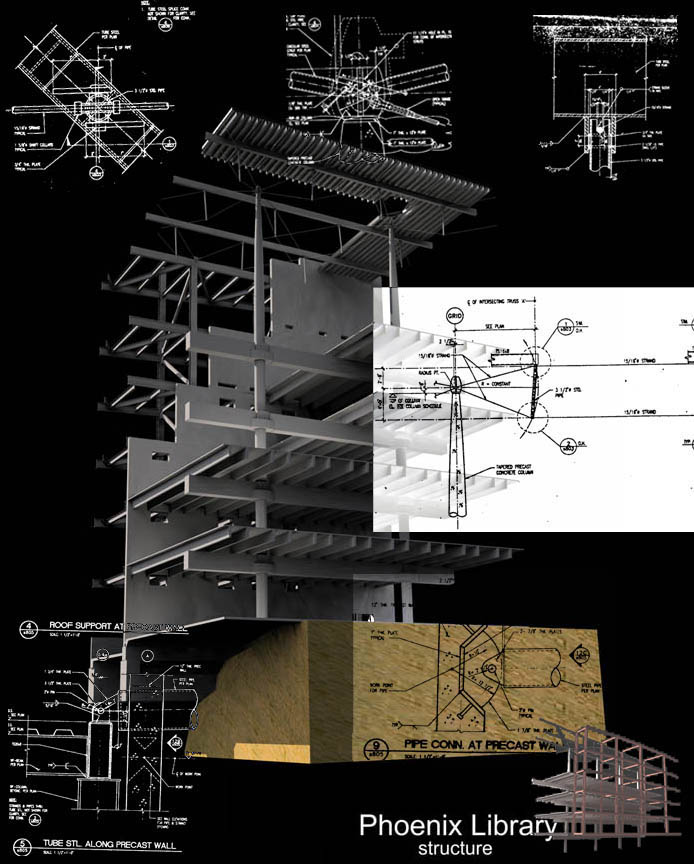 This rendering was created for Construction II class. The information was obtained from structural/architectural blue prints of the Phoenix Library.