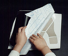 | 3- Colar as peças na parte adesiva de uma das folhas de plástico auto-adesivo , refazendo o desenho mas deixando um espaço de cerca de 2 a 3 milímetros entre elas; |
