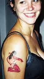 Bad photograph, great tattoo,... this little chica is Katie, who hiked out from Philadelphia for this piece. Originally, she was thinking of a Sailor Jerry styled devil girl, but showed up with some work by airbrush mistress Olivia, a Bettie Page devil girl. I was in heaven. I can't wait til she comes back to put the Bettie Page angel girl on the other arm. Katie is training as a professional female boxer, so when all her inking dreams are fulfilled, I want to get shots of her posing in the ring in full tape & gear, standing on the broken battered husk of a man who she's just pummeled into jelly. |