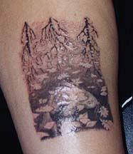 This is Mary, punk rock ska rudegirl from Jersey. She has plenty of bad homemade tattoos that she's dying to get covered, particularly a checkerboard band around her ankle she wants me to do, 'cause I've done work for Moon Records & High Times, so she thinks she's getting an authentic Jamaican ska tattoo. I thought we would be doing comic book characters, but when she came for her appointment, she pulled out this piece: M.C. Esher's 'Three Worlds',... I was impressed by her judgment, & also by the fact that I nailed it so hard, all in gray steps, no real black, & no outlines. The photo is a bit shiny, but you can at least see the side by side comparison that I would make the old boy proud. |